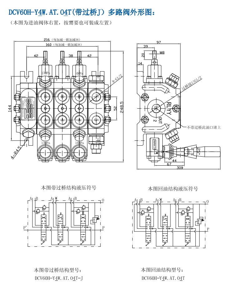 DCV系列多路換向閥是一種并聯(lián)的多路換向閥,中位采用專用流道卸荷,它由帶溢流閥的進(jìn)油閥、回油(過橋)閥體和若干個帶單向閥的換向閥組成;每組換向閥其工作油口可單獨(dú)配裝過載閥和補(bǔ)油閥。它具有體積小、重量輕、壓力高、通流量大的特點(diǎn);它可組成一到九個并聯(lián)的多路閥,其滑閥機(jī)能有0、Y、A三種基本型,按用戶需要,也可做成其它特殊型;其定位方式有彈簧復(fù)位和鋼球定位兩種。其滑閥尾部可做成伸出型并套有M8外螺紋,連接拉桿可實(shí)現(xiàn)兩端操縱。將回油閥體轉(zhuǎn)換成過橋結(jié)構(gòu)可將壓力油輸入下一操作機(jī)構(gòu)作壓力源。其進(jìn)油閥可左右隨意配置,本圖為右置,由于它的諸多特點(diǎn),現(xiàn)已在隨車起重機(jī)、鉆探機(jī)械和其它液壓機(jī)械中廣泛應(yīng)用。