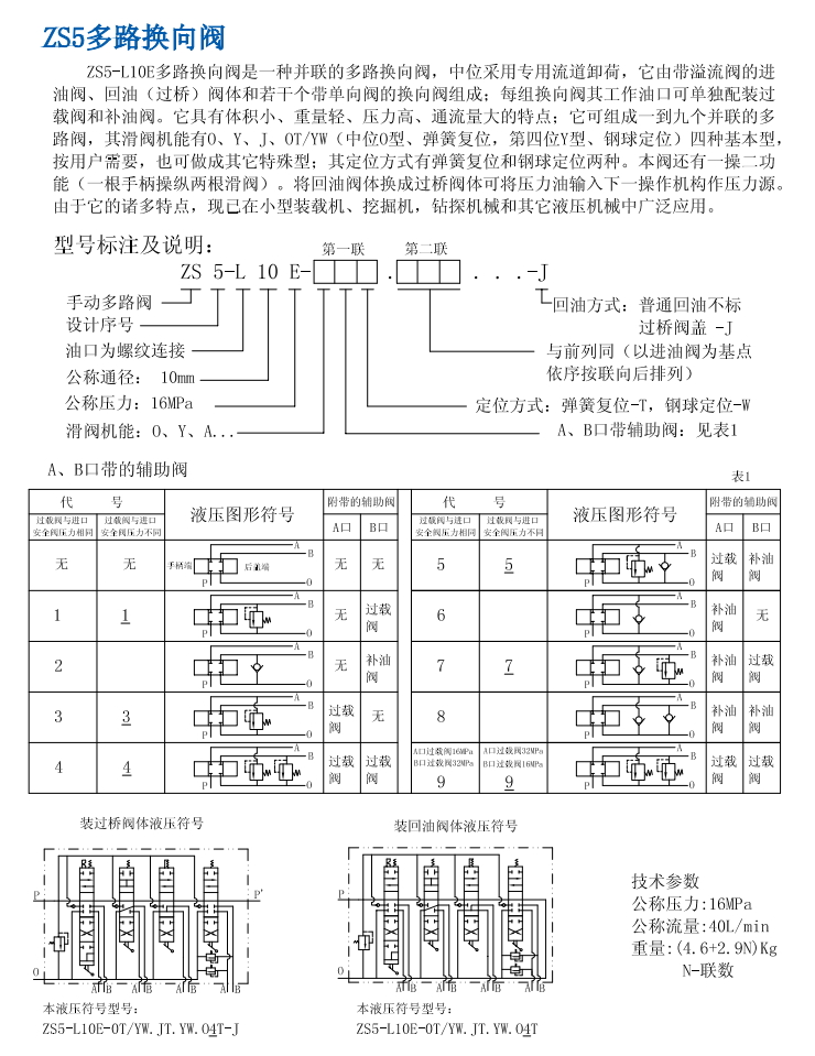 ZS5-L1OE多路換向閥是一種并聯(lián)的多路換向閥,中位采用專用流道卸荷,它由帶溢流閥的進(jìn)油閥、回油(過(guò)橋)閥體和若干個(gè)帶單向閥的換向閥組成;每組換向閥其工作油口可單獨(dú)配裝過(guò)載閥和補(bǔ)油閥。它具有體積小、重量輕、壓力高、通流量大的特點(diǎn);它可組成一到九個(gè)并聯(lián)的多路閥,其滑閥機(jī)能有0、Y、J、OT/YW(中位0型、彈簧復(fù)位,第四位Y型、鋼球定位)四種基本型,按用戶需要,也可做成其它特殊型;其定位方式有彈簧復(fù)位和鋼球定位兩種。本閥還有一操二功能(一根手柄操縱兩根滑閥)。將回油閥體換成過(guò)橋閥體可將壓力油輸入下一操作機(jī)構(gòu)作壓力源。由于它的諸多特點(diǎn),現(xiàn)已在小型裝載機(jī)、挖掘機(jī),鉆探機(jī)械和其它液壓機(jī)械中廣泛應(yīng)用。